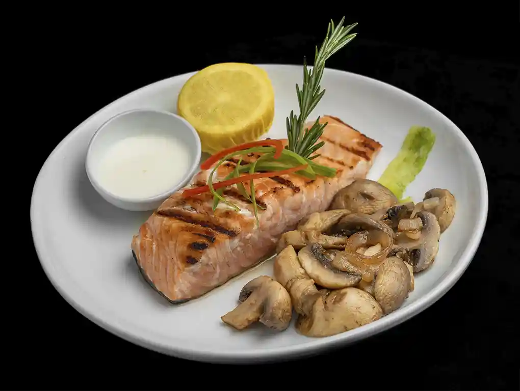 Salmon fillet, cooked on the griddle, served with a passion fruit sauce, broccoli and mashed potatoes.